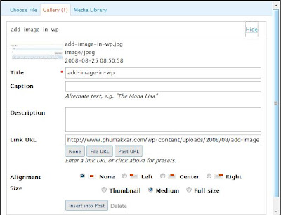 Add a relevant caption , notes. Choose a size. For Ghumakkar I would recommend that you choose ‘Full Size’. Word Press Administrator can control this size. And you are done.
